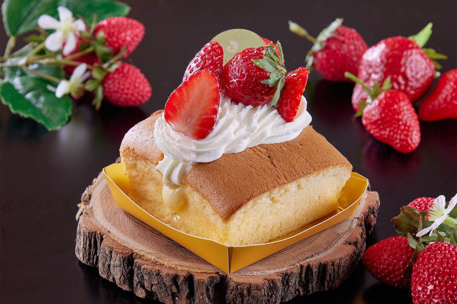 ふわしゅわ食感としっとりとした口当たりの生地に、自家製カスタードクリームと生クリームを挟み込み、いちごをトッピングしました。