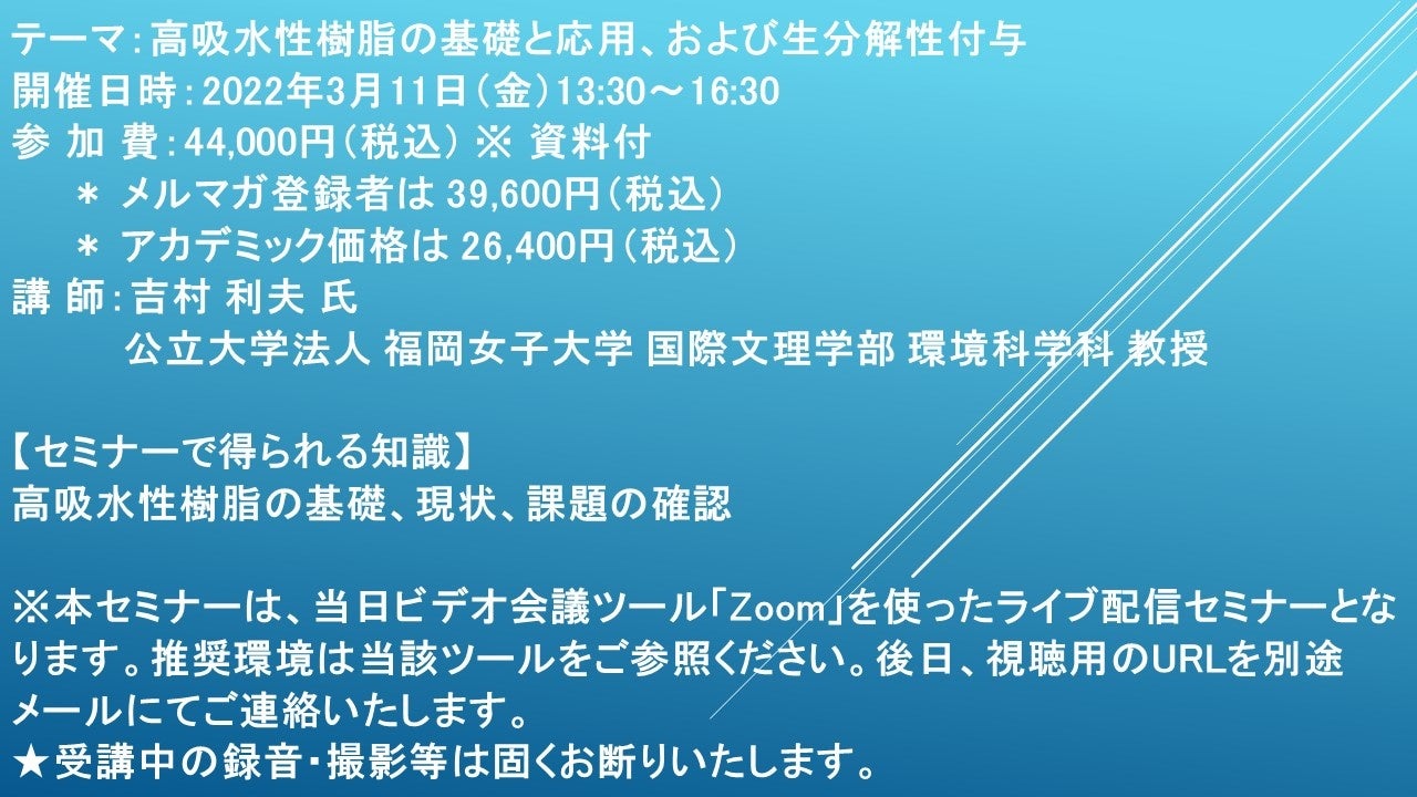 先端技術情報や市場情報を提供している(株)シーエムシー・リサーチ(千代田区神田錦町: https://cmcre.com/ )では、 各種材料・化学品などの市場動向・技術動向のセミナーや書籍発行を行っておりますが、 このたび「高吸水性樹脂の基礎と応用、および生分解性付与」と題するセミナーを、 講師に吉村 利夫 氏 公立大学法人 福岡女子大学 国際文理学部 環境科学科 教授)をお迎えし、2022年3月11日(金)13:30より、 ZOOMを利用したライブ配信で開催いたします。 受講料は、 一般:44,000円(税込)、 弊社メルマガ会員:39,600円(税込)、 アカデミック価格は26,400円(税込)となっております(資料付)。