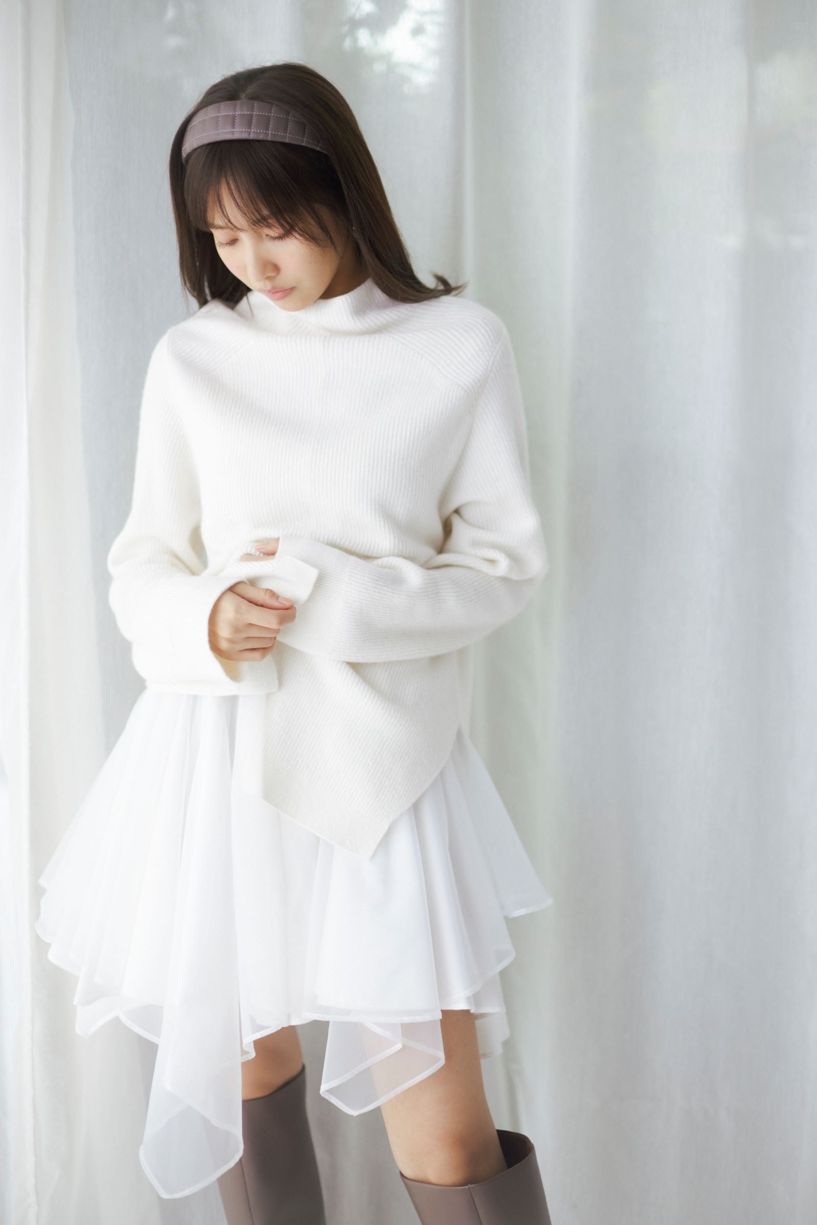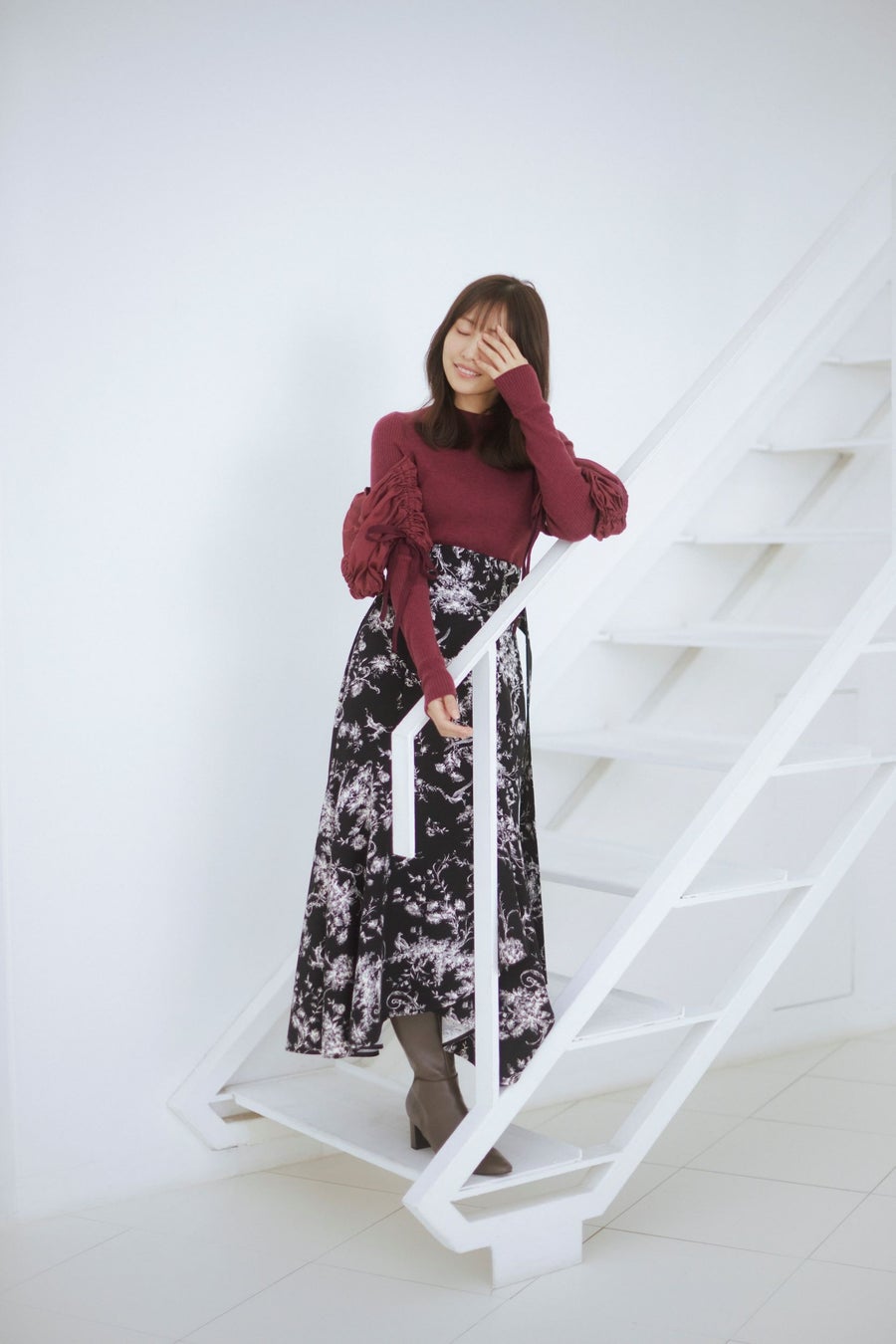裾をアシンメトリーかつボリューミーに仕上げることで、モード感と女性らしさの両方を表現。