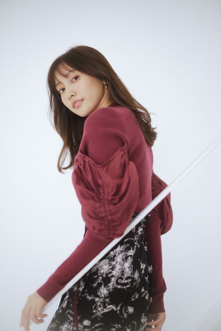 ギャザーパフ袖をアームホールに取り付けた※、※華やかかつモードなニットプルオーバー。