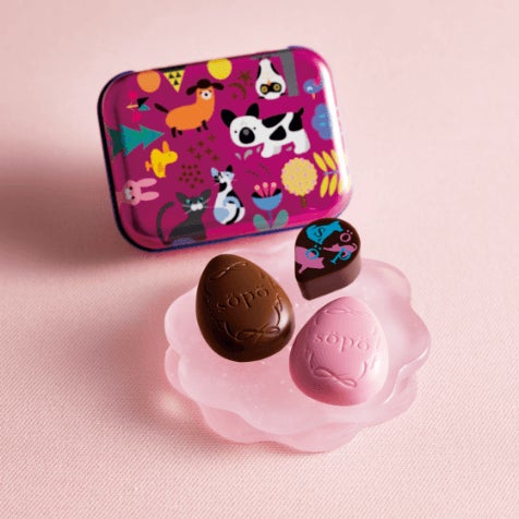 <söpö(ソポ)>はフィンランド語で"可愛い"の意味。動物が描かれた手のひらサイズの缶の中には、アーモンドガナッシュを包んだプリントチョコや、3種のプレーンチョコが入っています。