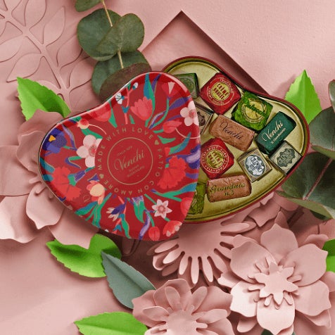 〈Venchi〉を代表するクリエーティブなチョコレート「チョコピア」をはじめ、7種類の個性的なチョコレートをアソート。2023年バレンタインシーズン限定の、シックな深い赤のハートギフト缶に詰め合せて。