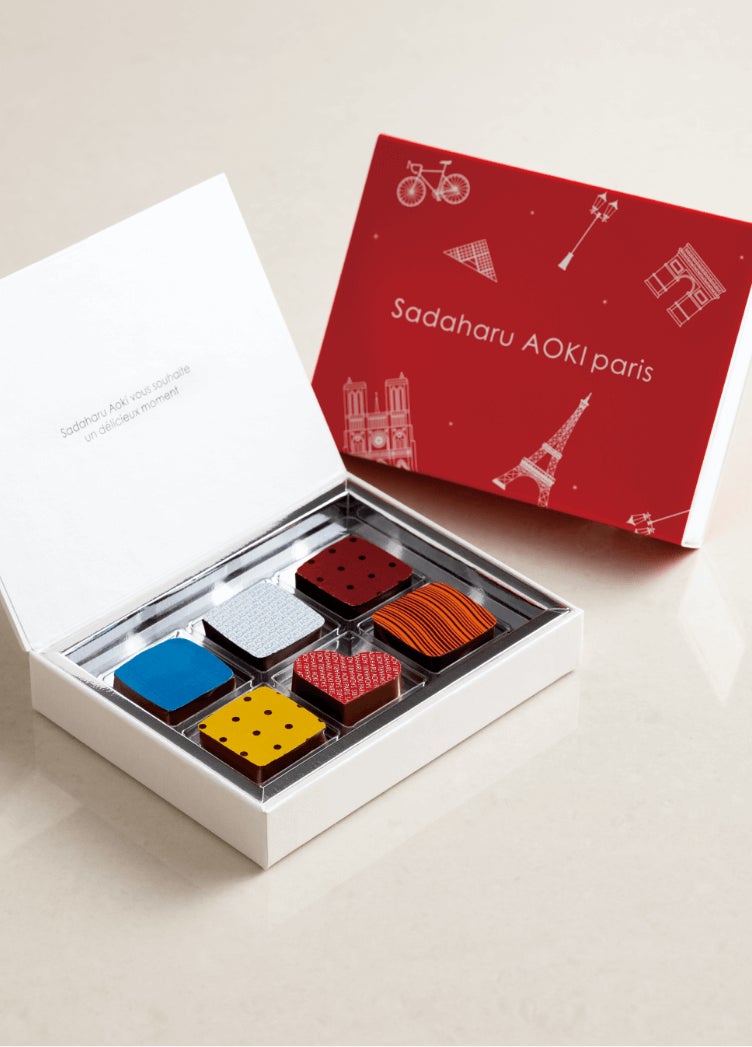 自身の名を付け発表する新作ショコラのアソート。2023年のテーマは「フルーツとお茶」。アオキ氏が得意とする“お茶”の風味、香りを閉じ込めた新作3粒に、ショコラ品評会“C.C.C.”受賞作などを詰め合わせて。