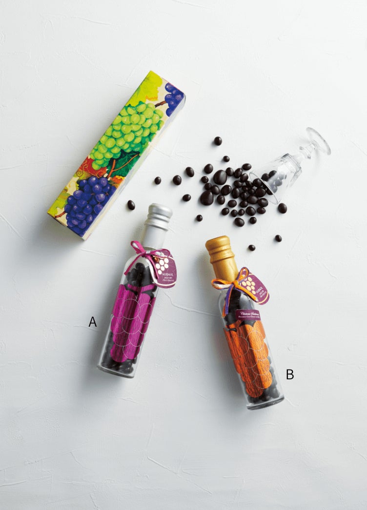 (A)金色のドライレーズンを、ボルドー産貴腐ワインに漬け込み、ビターチョコレートでコーティング。ぶどうの酸味とチョコの甘みは熟成され、数ヶ月後には酸味は穏やかに、香りはいっそう芳醇に変化します。