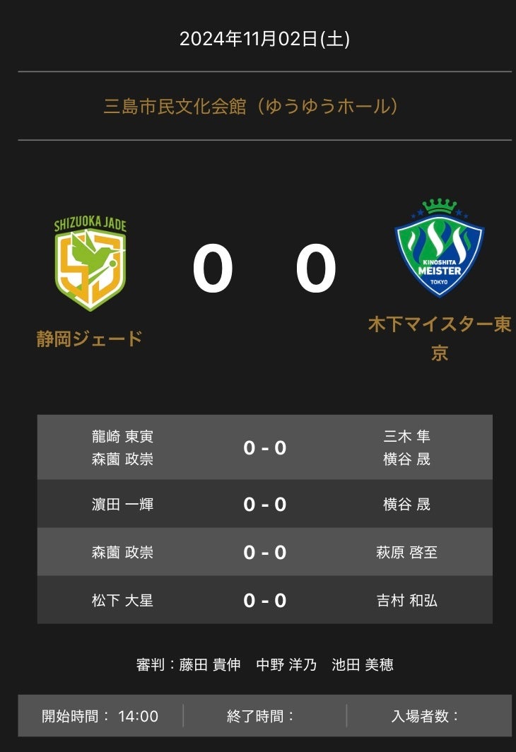 ノジマTリーグ 2024-2025シーズン 公式戦 11月2日開催 静岡ジェード vs 木下マイスター東京 オーダー発表