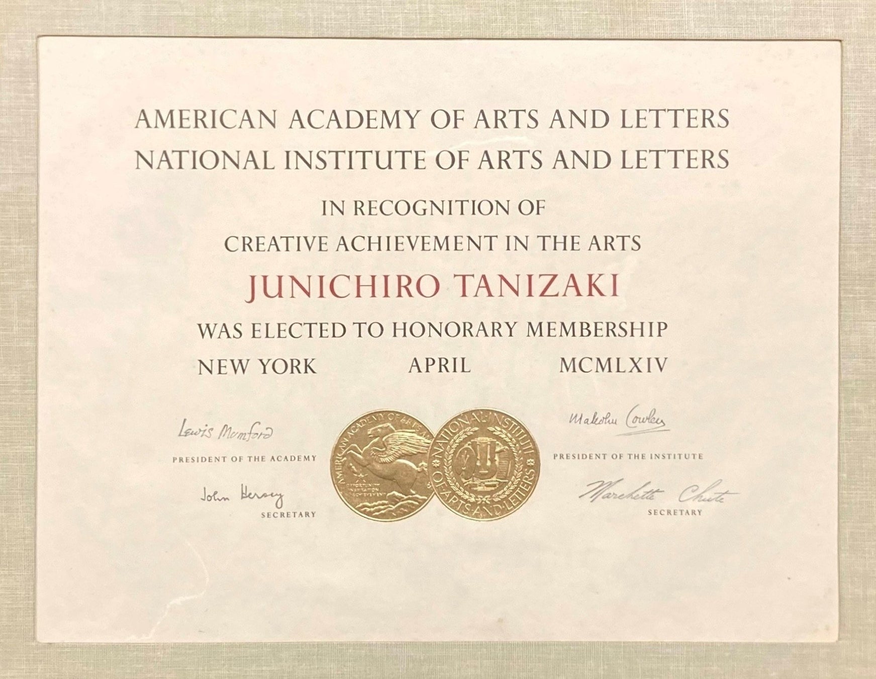 この他、師と仰ぐ先輩文豪永井荷風に宛てられた、敗戦時の二人をめぐる有名なエピソードを導いていく谷崎の手紙や、なぜかバラバラに裁断された小説原稿、家族思いの谷崎の一面が垣間みられる馴染みの医師への書簡、文豪最晩年の栄誉を輝かしく縁どる日本人で最初に授与されたアメリカの文芸アカデミーの会員証等々、ニュー・フェースたちは、多士済々です。特設展では、そのそれぞれの魅力、秘められた物語、一筋縄ではいかない個性を、存分にアピールしていただきます。