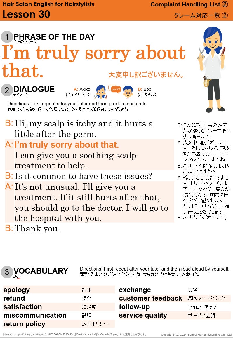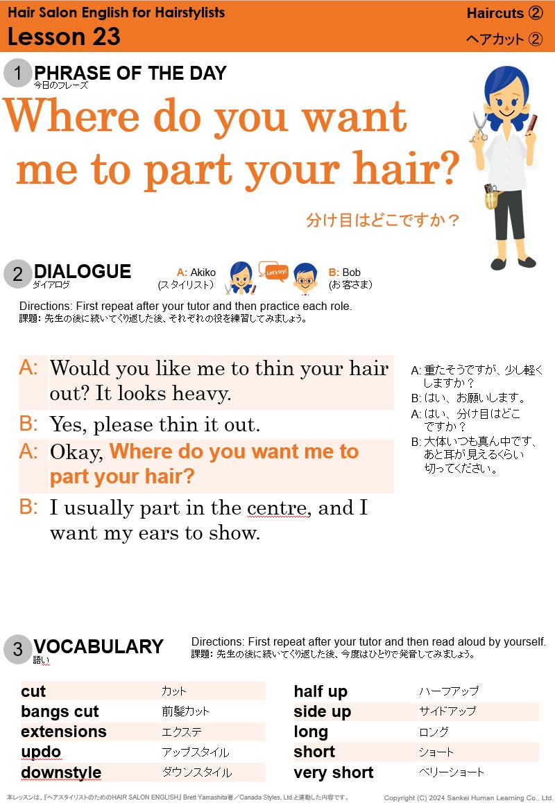 産経ヒューマンラーニング株式会社(本社:東京都新宿区、代表取締役:中谷友紀、以下「当社」)は、産経オンライン英会話Plusの21種類ある「職業別英会話」のひとつ「美容院」テキストを、北米で美容室を運営し、日本の美容師向けにインターンシップ留学斡旋事業も展開しているCanada Styles Ltd.の監修のもとリニューアルいたしました。2025年1月31日(金)より提供を開始いたします。