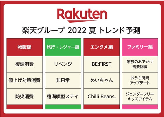 このたび発表した「楽天グループ 2022夏トレンド予測」では、「楽天市場」「楽天ブックス」「楽天トラベル」「Rakuten Music」「楽天ママ割」における流通額やユーザーの利用状況のデータをもとに、生活用品、食品、衣料品、書籍、旅行、音楽など幅広いジャンルから今夏のトレンド予測を発表し、「復調消費」や「リベンジ旅行」など、ポストコロナ時代に移行した今夏ならではのトレンドキーワードを選出しました。