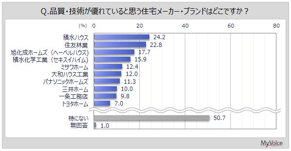 品質・技術が優れていると思う住宅メーカーは(複数回答)、「積水ハウス」が24.2%、「住友林業」が22.8%、「旭化成ホームズ」「積水化学工業」が各2割弱です。