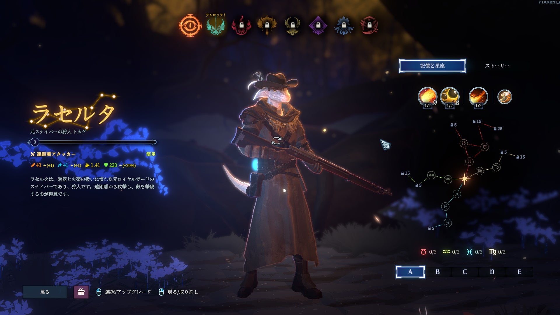 それぞれバックストーリーを持つ8人のキャラクターが登場、そのキャラを特長付ける「旅人熟練度システム」や、戦略的なビルドアップ(キャラ構成・育成)を支援する「星座システム」も特長です。