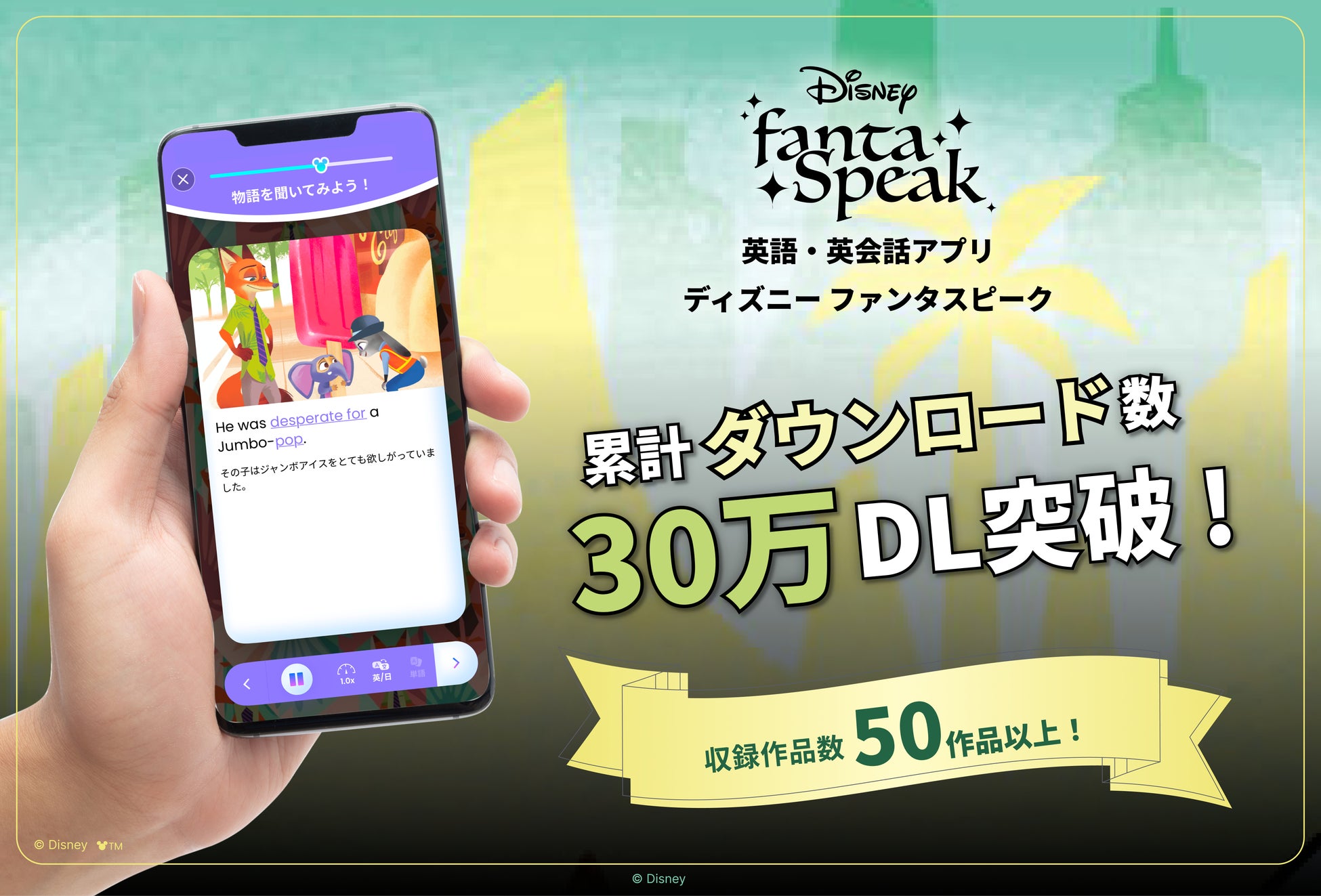 2025年8月に累計30万ダウンロードを突破した「ディズニー ファンタスピーク」は、ディズニーやピクサーの50作品以上を題材に、英語力を「楽しく」のばせる、大人向けの総合英語学習アプリです。