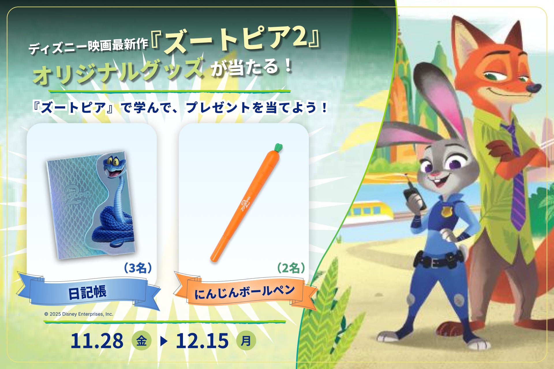 ・教材追加を記念して、『ズートピア』で学んで、ディズニー映画最新作『ズートピア2』オリジナルグッズが当たる学習応援イベントを開催