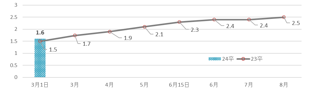 2024年卒の大学生・大学院生の3月1~3日時点での内々定率は前年比3.0pt増の18.1%で、平均内々定保有社数は前年比0.1社増の1.6社となった。企業を対象にした調査によると、採用予定数を増やす割合は約3割と前年に比べ増加し※、企業の採用意欲が高まっていることから、3月上旬時点で内々定率・平均内々定保有社数がともに増加したと考えられる。【図1、2、3】