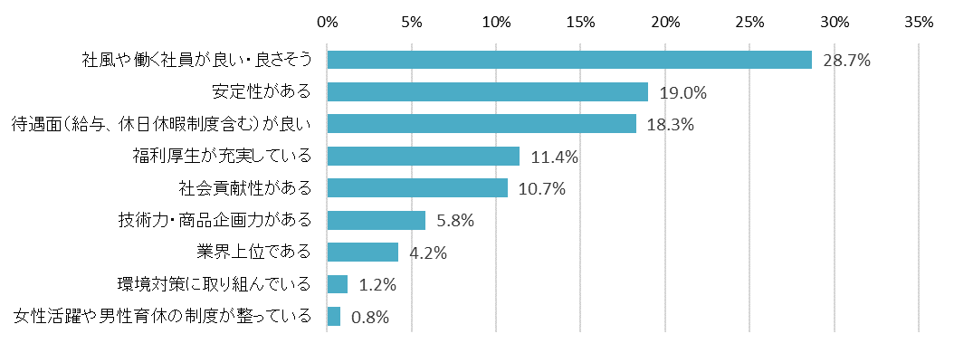学生が就職先を選ぶ際のポイントとして最も当てはまるものを聞くと、最多の回答は「社風や働く社員が良い・良さそう(28.7%)」で、「安定性がある(19.0%)」、「待遇面(給与、休日休暇制度含む)が良い(18.3%)」が続いた。「社風・働く社員」を選んだ理由では「長く仕事を続けるうえで人間関係が重要だから」「一緒に働く人は仕事のモチベーションを左右する」などの声が挙がった。【図4、5】