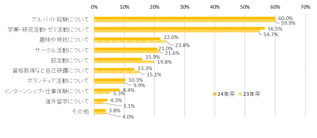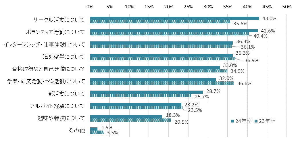 ガクチカ(学生時代に力を入れて取り組んだこと)でアピールできそうなポイントを複数回答してもらったところ、最多の回答は「アルバイト経験について」が60.0%で、「学業・研究活動・ゼミ活動について」が56.5%で続いた。一方で、不足を感じるポイントを聞くと、最も多かったのは「サークル活動について」が43.0%、次いで「ボランティア活動について」が42.6%となった。サークル活動や部活動といった課外活動に関する項目は、不足を感じるという回答が前年より増加した。2024年卒の学生は入学初年度の2020年にコロナ禍を迎えたことから、大学生活での活動制限が多かったため、課外活動に参加しづらかった可能性が考えられる。【図6、7】