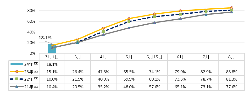 - 2024年卒の大学生・大学院生の内々定率は前年比3.0pt増の18.1%【図1、2、3】