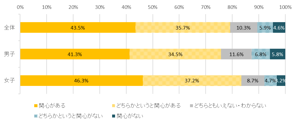 2023年4月より、従業員規模1,000人以上の企業に対して男性社員の育児休業取得率等の公表が義務化される。これに際し、従業員規模に関わらず、企業選びにおける男性社員の育児休業取得率への関心について聞いたところ、「関心がある」学生は79.2%となり(「関心がある(43.5%)」と「どちらかというと関心がある(35.7%)」の合計)、8割近くが関心を寄せていることがわかり、男女別でも大きな差はなかった。昨年10月より出生時育児休業(産後パパ育休)が施行されるなど男性の育児休業取得が議論されてきているなか、学生の企業選びにおいても、男女関係なく関心の的となっていることがわかる。【図8】