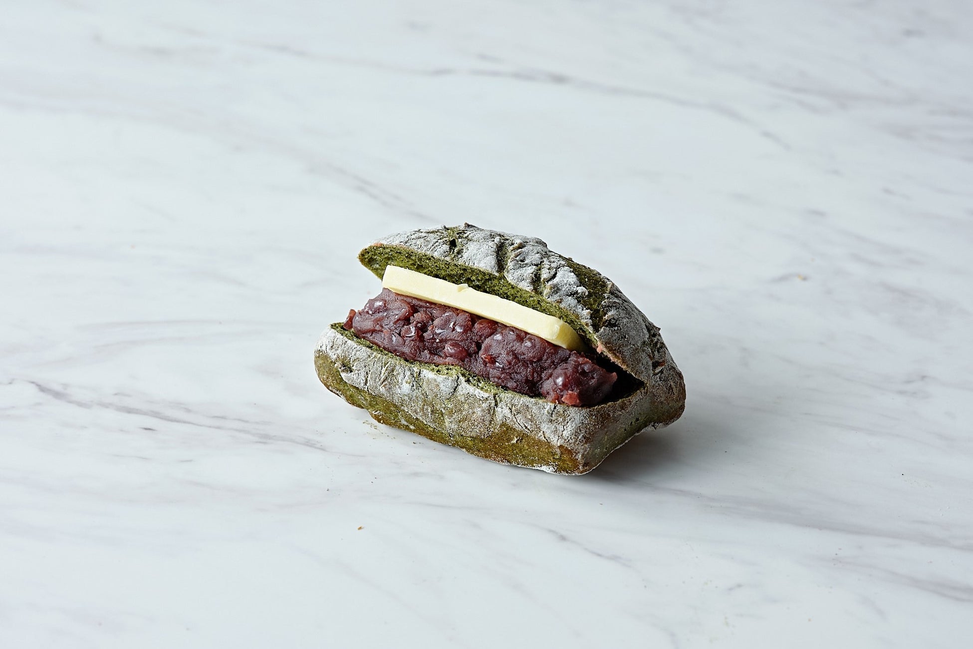 抹茶のチャバタに北海道つぶあんと有塩バターをサンド。