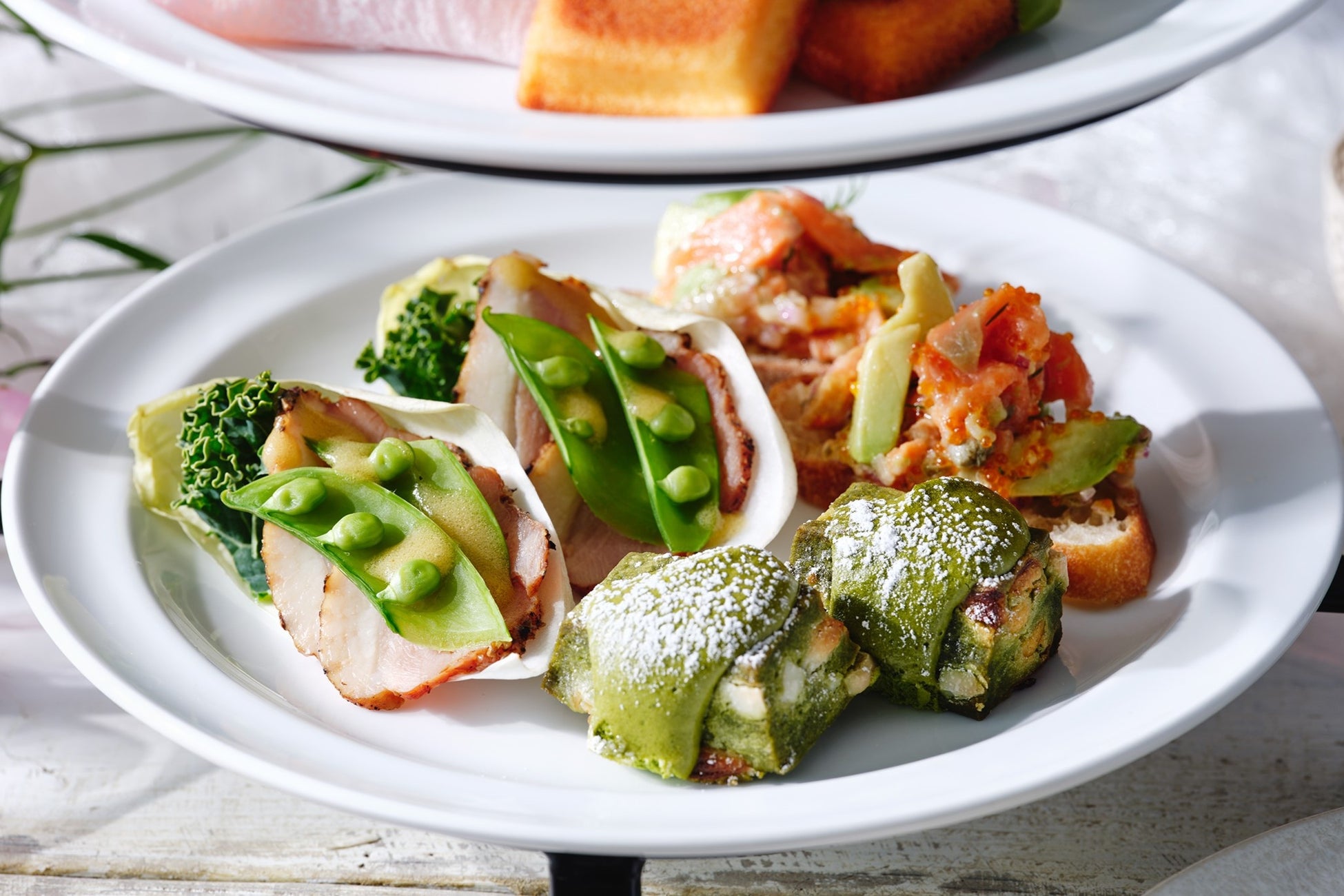 下段)セイボリーには、チコリの上にスモークした鴨と季節野菜を乗せたサラダ、抹茶のスコーン、サーモンとアボカドのタルティーヌ。