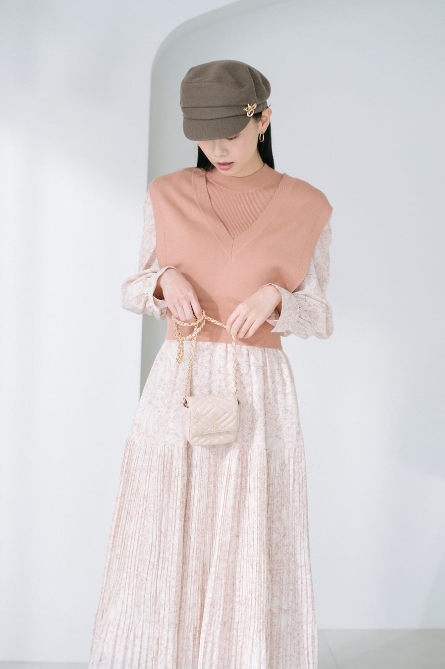 大人な印象を与えるフラワー柄のワンピースにニットベストを組み合わせたレイヤードアイテム。