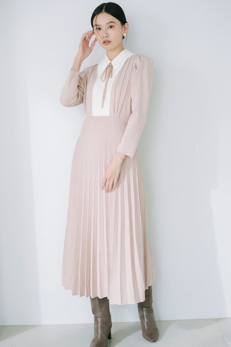 スカート部分に細かなプリーツを施すことで品の良いフレアシルエットに。