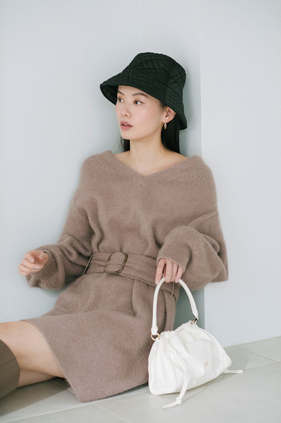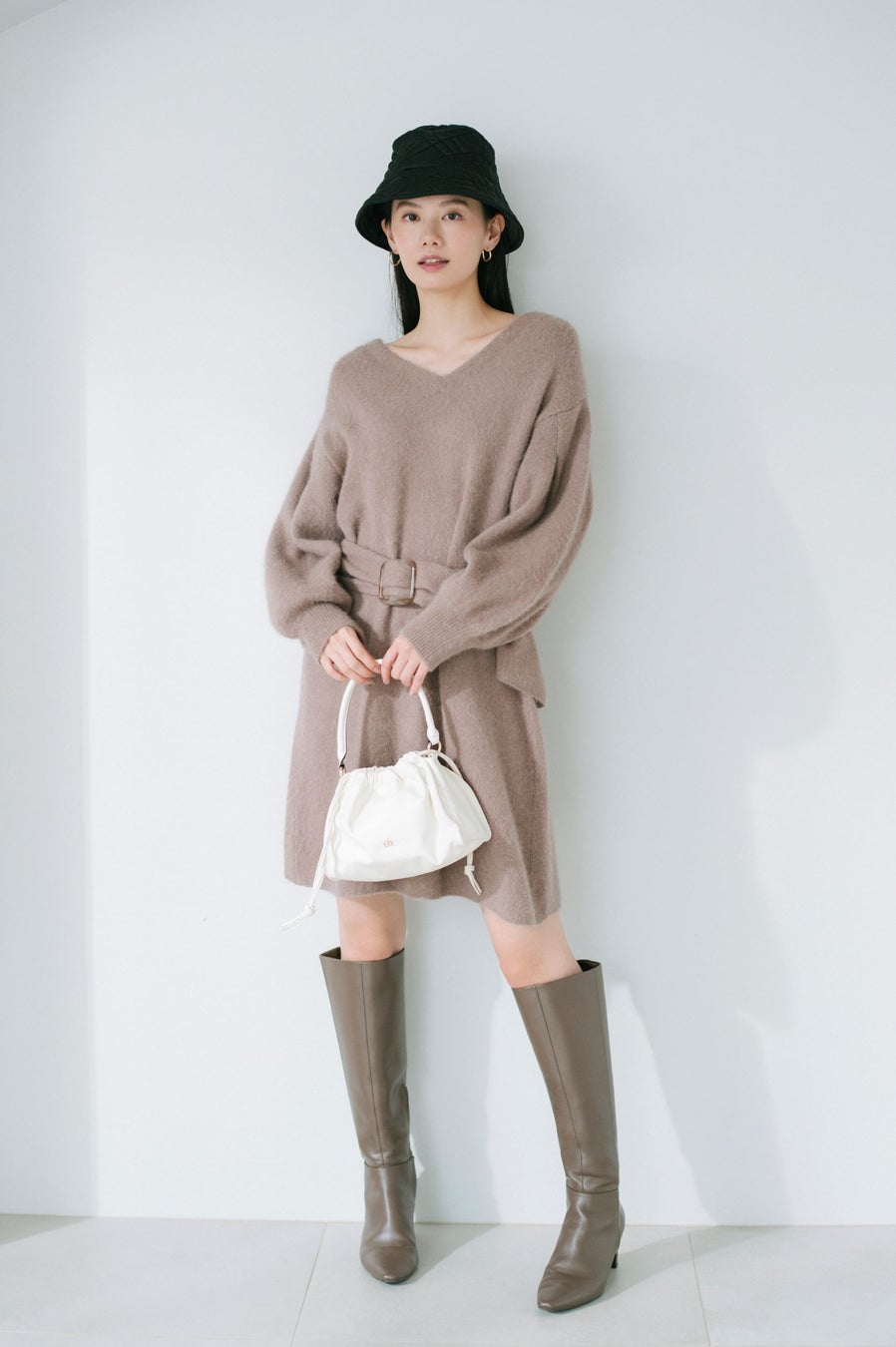 付属のベルトでウエストをマークすれば、メリハリのあるスタイリングに。