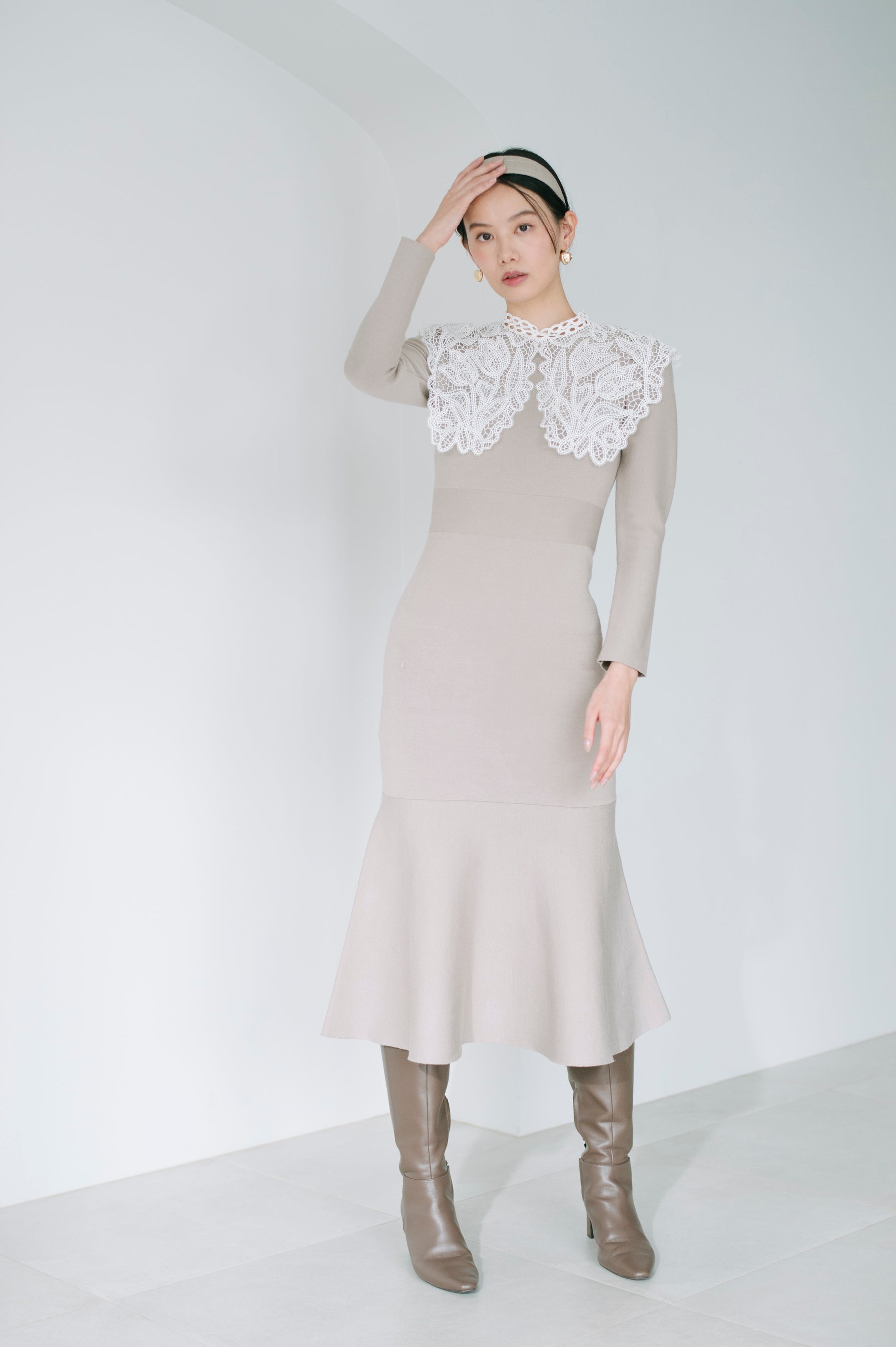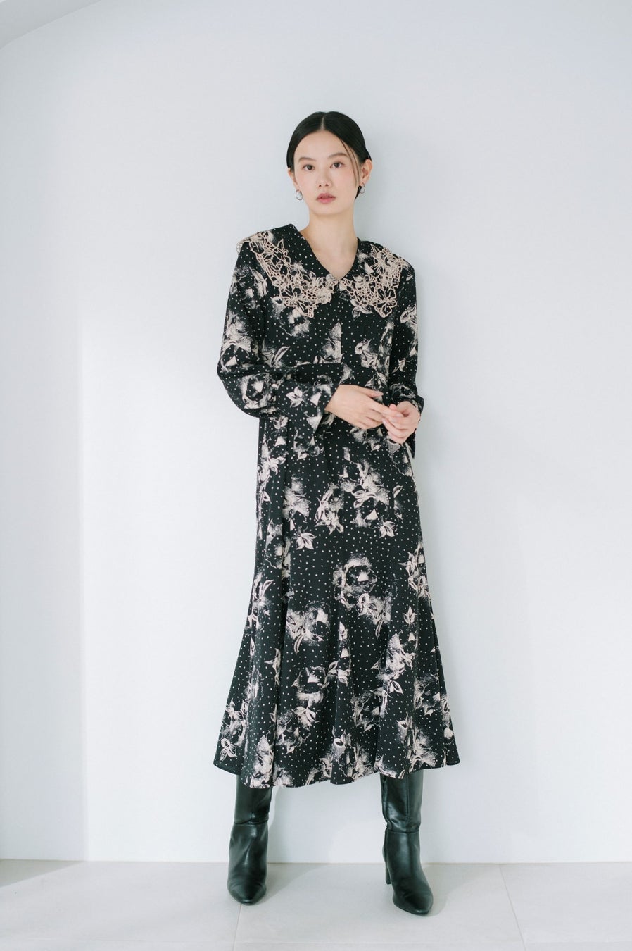 オリジナルの繊細な刺繍が施された大きめのレースカラーが印象的な、クラス感溢れる上品な1着。