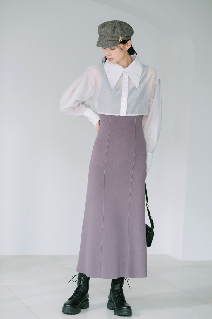 トレンド感のあるクロップド丈のシャツとノースリーブのニットワンピースを組み合わせたセットアイテム。
