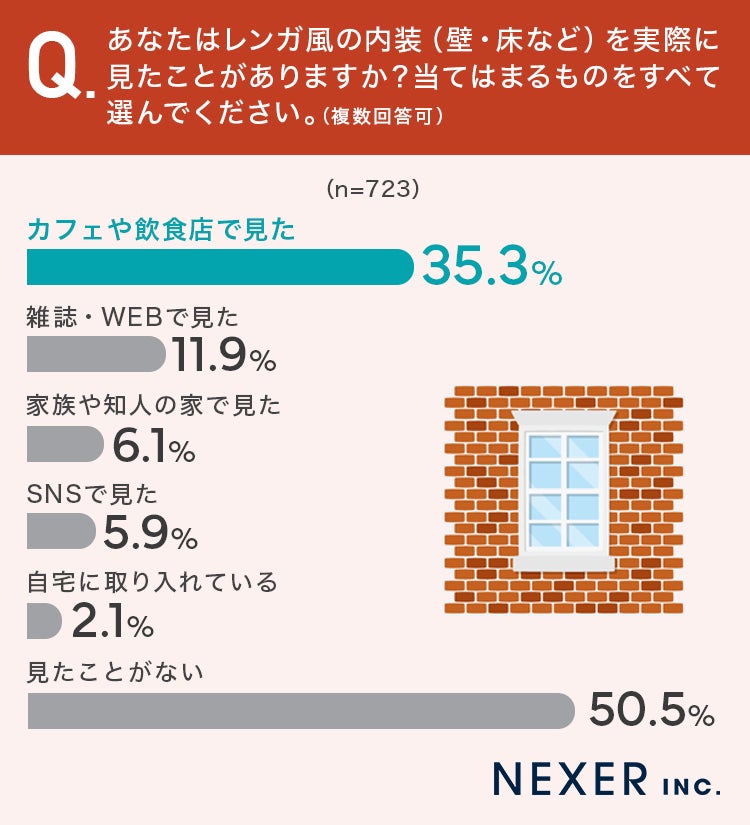続いて、レンガ風の内装(壁・床など)を実際に見たことがある場所はどこか聞いてみました。