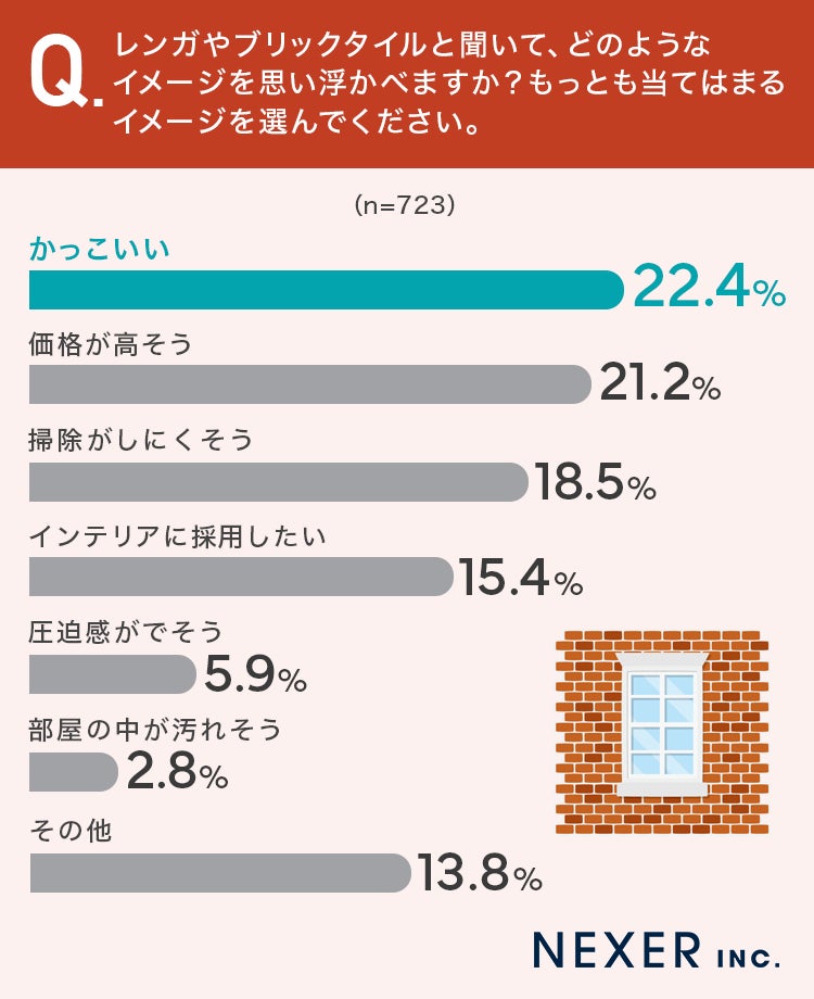 【レンガやブリックタイルのイメージは?】22.4%が「かっこいい」と回答しもっとも多い結果に