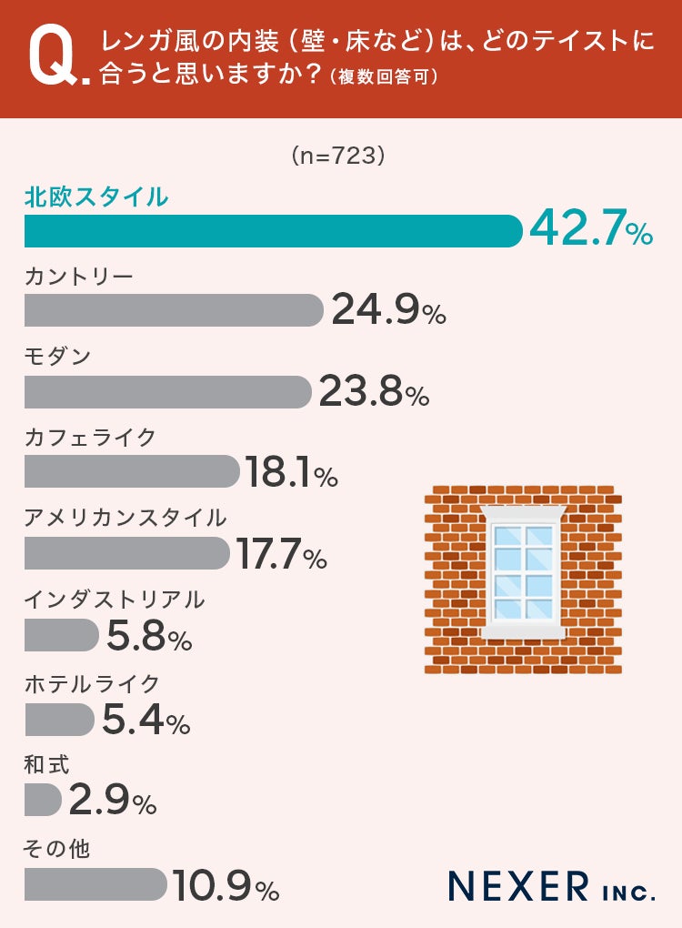 次に、レンガ風の内装が似合うのはどんなスタイルだと思うか複数回答で答えてもらいました。