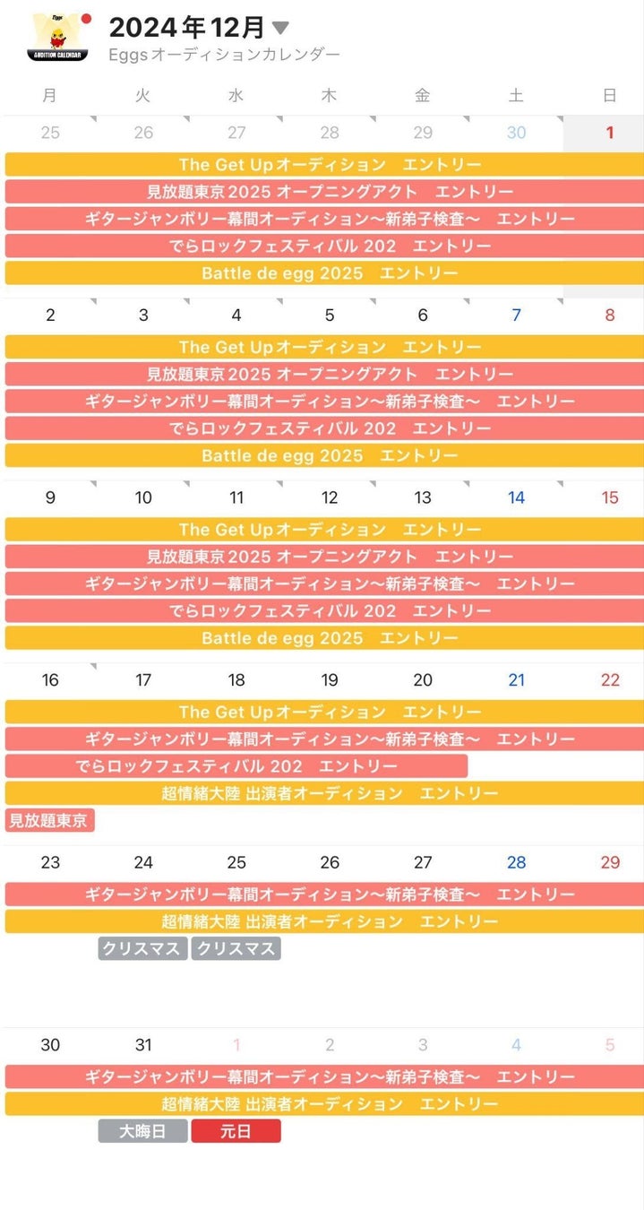 インディーズを中心とした3万組以上のアーティストと60万人以上のリスナーが登録する無料音楽プラットフォーム「Eggs」や個人で活動するアーティストやインディーズ音楽関連企業向けのマネタイズ支援機能を提供する「Eggs Pass」で募集しているオーディション情報が掲載されているカレンダーです。応募等のスケジュールが集約され、チャンスを見逃すことなくオーディションにご参加いただけます。
