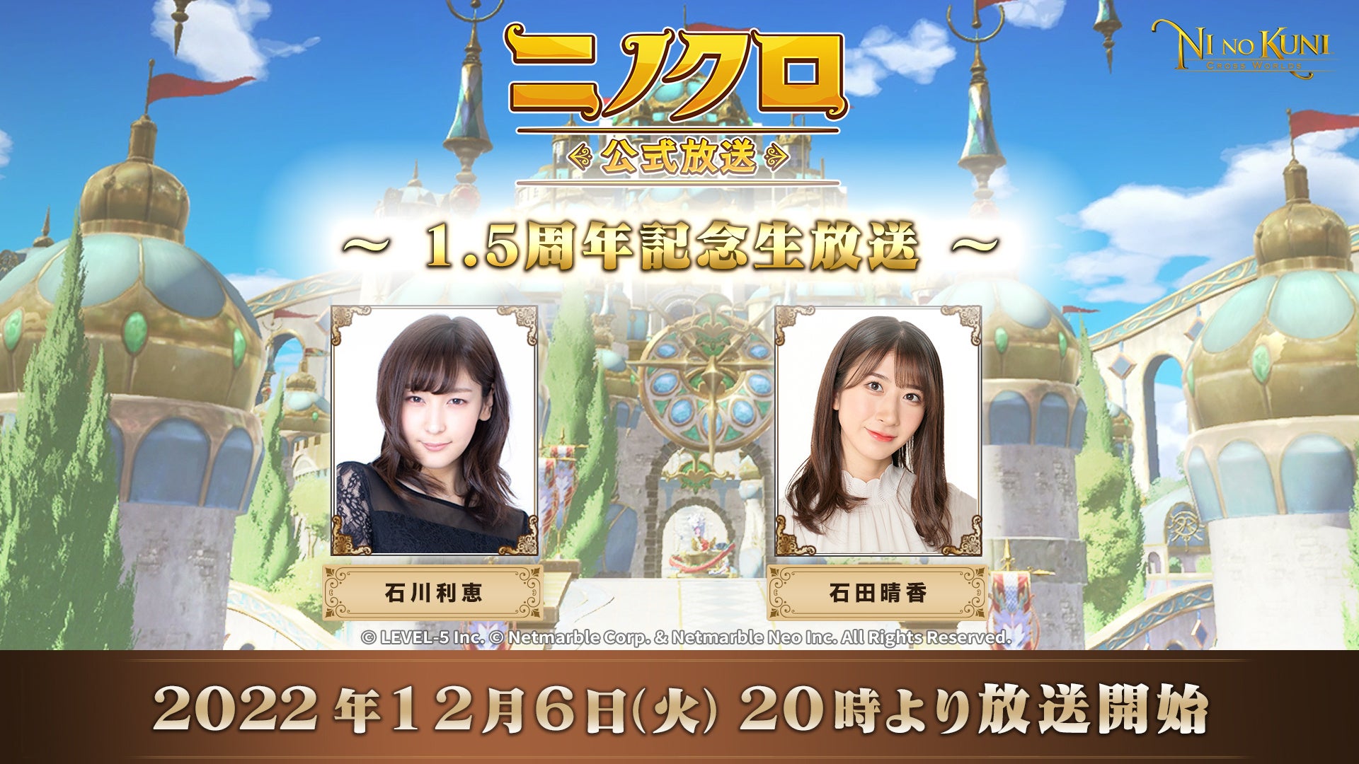 ネットマーブルは、レベルファイブとタッグを組みサービスを提供しているファンタジーアートRPG『二ノ国:Cross Worlds』(略称:ニノクロ)のサービス1.5周年を記念して、12月6日(火)20時より、公式番組「ニノクロ公式放送」をTwitterやYouTubeにて生配信することをお知らせいたします。本番組では近日実施予定の1.5周年記念アップデートの情報や、キングダム対戦イベント「エキシビションマッチ」の模様をお届けいたします。