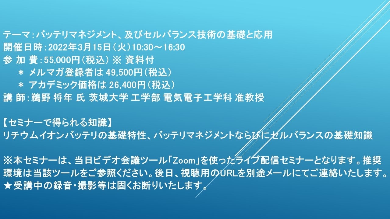 先端技術情報や市場情報を提供している(株)シーエムシー・リサーチ(千代田区神田錦町: https://cmcre.com/ )では、 各種材料・化学品などの市場動向・技術動向のセミナーや書籍発行を行っておりますが、 このたび「バッテリマネジメント、及びセルバランス技術の基礎と応用」と題するセミナーを、 講師に鵜野 将年 氏 茨城大学 工学部 電気電子工学科 准教授)をお迎えし、2022年3月15日(火)10:30より、 ZOOMを利用したライブ配信で開催いたします。 受講料は、 一般:55,000円(税込)、 弊社メルマガ会員:49,500円(税込)、 アカデミック価格は26,400円(税込)となっております(資料付)。