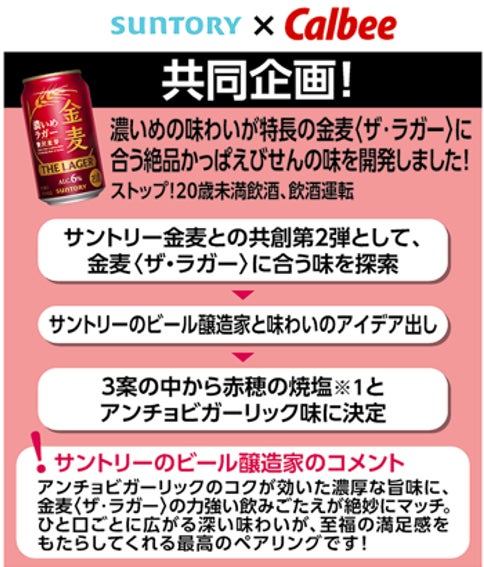 カルビー×サントリーの共同開発商品が新登場!ビール醸造家も認めた※1、「金麦〈ザ・ラガー〉」に合う『絶品かっぱえびせん 赤穂の焼塩とアンチョビガーリック味』