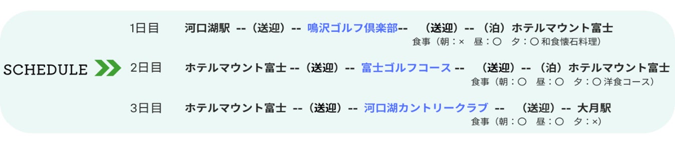 1日目は新宿駅7:30発、河口湖駅9:28着の「富士回遊3号」を利用、富士山エリアでは2泊3日行程、3コースでゴルフプレーを実施します。商品には、ゴルフプレー代金、宿泊、食事、ゴルフ場への送迎車、往復の列車、食事が含まれたパッケージ商品となります。3日目はプレー終了時間にあわせ、大月駅まで送迎、新宿まで「あずさ号」又は「かいじ号」を利用します。