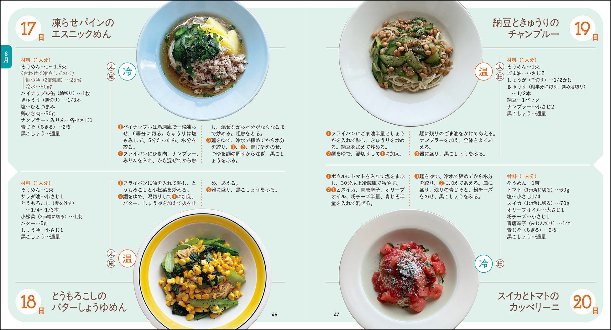 毎日そうめんを食べ続け、考案したレシピは1500以上という著者が贈る本書は、そうめん好きはもちろん、ふだんの食生活の強い味方となってくれる1冊です。