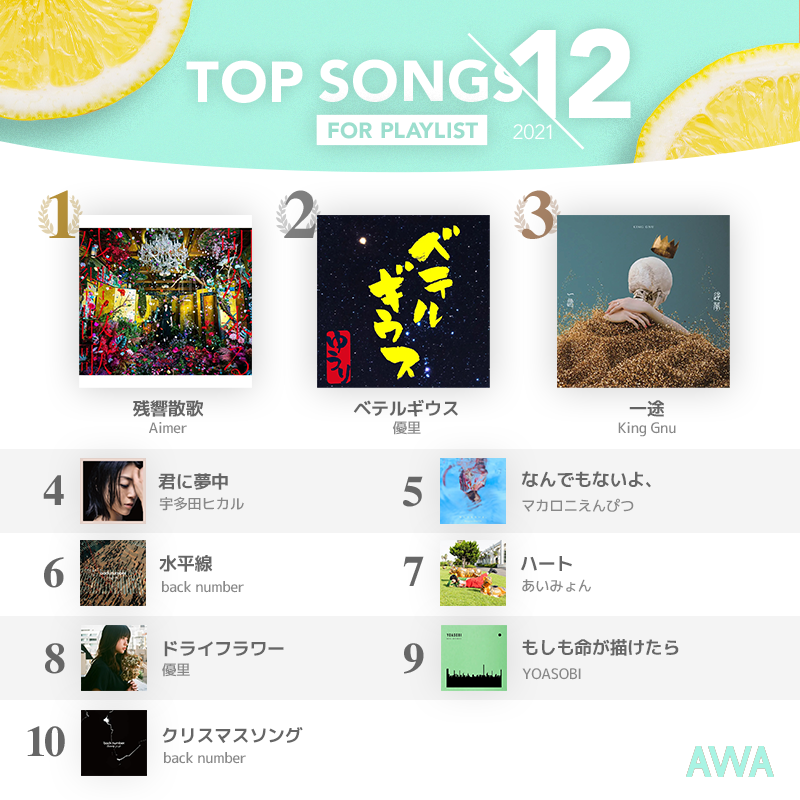 AWA株式会社(本社:東京都港区、代表取締役CEO:冨樫晃己)が運営する、サブスクリプション型(定額制)音楽ストリーミングサービス「AWA(アワ)」は、2021年12月1日(水)から12月29日(水)までに、ユーザーが作成したプレイリストへ採用された楽曲を集計し、12月度の『プレイリスト採用楽曲ランキング』を発表いたしました。