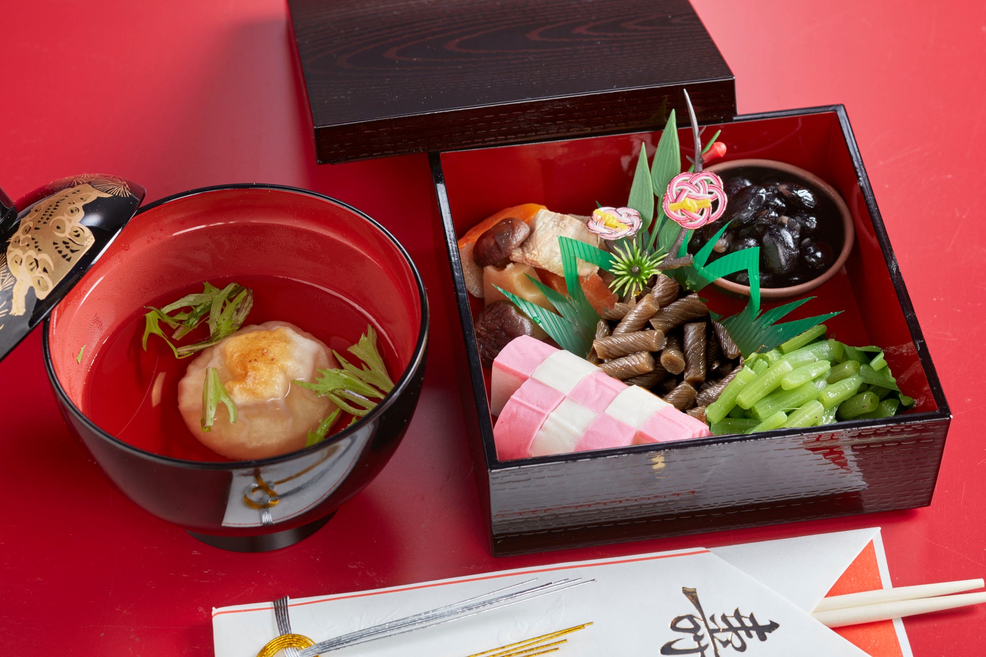 1月1日(水・祝)~1月5日(日)の5日間は、関東風の「すまし雑煮」、関西風の「白みそ雑煮」の2種類をご用意。それぞれの地域の味わいを堪能できます。また、かまぼこや黒豆など6種類の「おせち料理」もラインアップ。