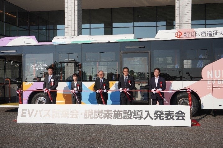 NSGグループの新潟医療福祉大学(以下、本学)は、7月3日(木)、NSGグループの愛宕商事株式会社(新潟市中央区)との連携により、通学用EV(電気)バスを導入し、「EVバス試乗会・脱炭素施設導入発表会」を学内で開催しました。