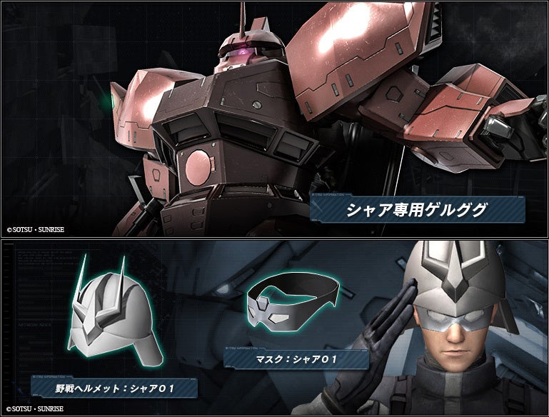 アクセサリーの「野戦ヘルメット:シャア01」「マスク:シャア01」などが手に入る