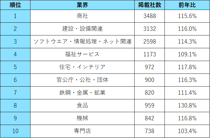 - 業界別の掲載社数のトップ3は「商社」「建設・設備関連」「ソフトウエア・情報処理・ネット関連」。前年比で掲載社数の増加率が高かったのは「鉄道・航空」「スポーツ・玩具・ゲーム製品」「人材サービス(派遣・紹介)」【図3、4】