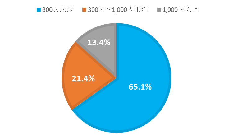 - 企業規模別の掲載社数割合は、「300人未満」が全体の65.1%、「300人~1,000人未満」が21.4%、「1,000人以上」が13.4%【図2】