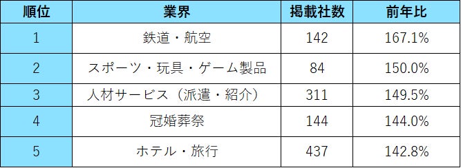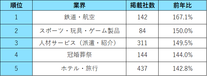 ・業界別に掲載社数を見ると、48業界中のトップ3は「商社」「建設・設備関連」「ソフトウエア・情報処理・ネット関連」となった。前年に比べ最も掲載社数の増加率が高かったのは前年比167.1%の「鉄道・航空」で、次いで前年比150.0%の「スポーツ・玩具・ゲーム製品」、前年比149.5%の「人材サービス(派遣・紹介)」が続いた。そのほか、「冠婚葬祭」「ホテル・旅行」も前年に比べ大きく増加した。【図3、4】