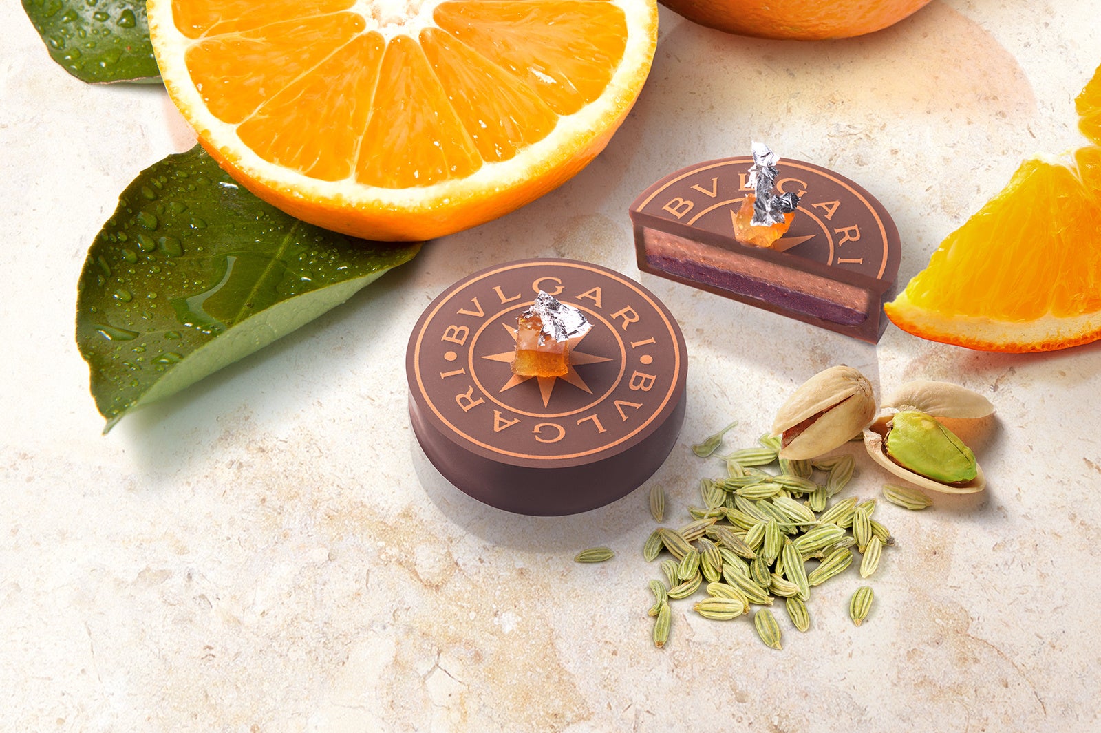 季節限定チョコレート·ジェムズの新作フレーバーは、シチリア州で旬を迎えるオレンジとピスタチオを使った二層構造の魅力的なひと粒です。豊かな陽光と肥沃な土壌が生んだシチリア産オレンジのジェラティーナは、ひと口で果汁があふれるように広がり、地中海の風を思わせる爽やかな余韻を残します。古代からこの地の美食の系譜に名を連ねるシチリア産ピスタチオの深みと、シチリア料理に欠かすことのできないフェンネルの清らかな香りを内包したプラリネは、なめらかにとろける口溶けが芳醇な香りを引き立たせます。