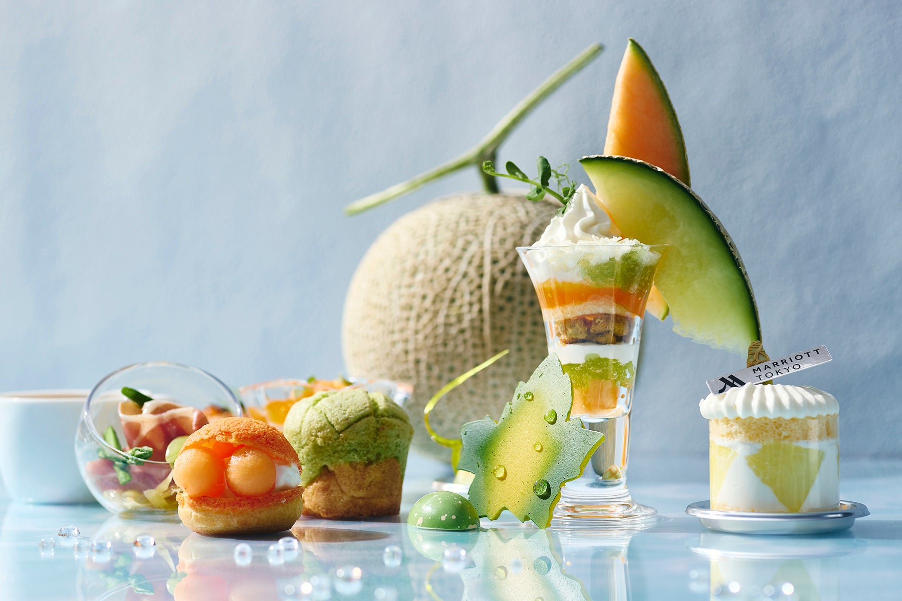 都会の中でも自然豊かな御殿山で、四季の移ろいを感じながらお楽しみいただく東京マリオットホテルのアフタヌーンティー。5月~6月は昨年多くのご好評をいただいた高知県「西島園芸団地」の当ホテル専用の畑から直送される2種のマスクメロンを主役に、味わいへのこだわりをさらに究めて再び皆様をお迎えします。青肉は上品なアロマととろける舌触り、赤肉は爽やかな香りと緻密な食感、どちらも皮際まで糖度14度以上の甘さをしっかりと楽しめるのが特長です。スイーツは、大振りにカットされた2色のメロンが目を引くパフェや青肉マスクメロンの豊かな香りと生クリームの相性をダイレクトに感じられるショートケーキなど8品をご用意。セイボリーは、ハーブが爽やかに香るスモークサーモンのサンドウィッチやオマール海老の旨味がたっぷり詰まったビスクなど、食欲そそる4品が並びます。