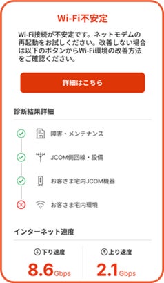 これまで、J:COMサービスご利用時に問題が生じた際は、J:COMサポートお問い合わせ窓口等までご連絡いただいておりました。MY J:COMアプリ内にある本メニューは「J:COM TV」、「J:COM NET」、「J:COM PHONE」サービスの利用機器の状態をお客さまご自身で確認し、ご利用において問題がないか診断するものです。また、機器や利用状況に問題がある場合は、その原因と改善方法をMY J:COMアプリから24時間いつでも確認できます。