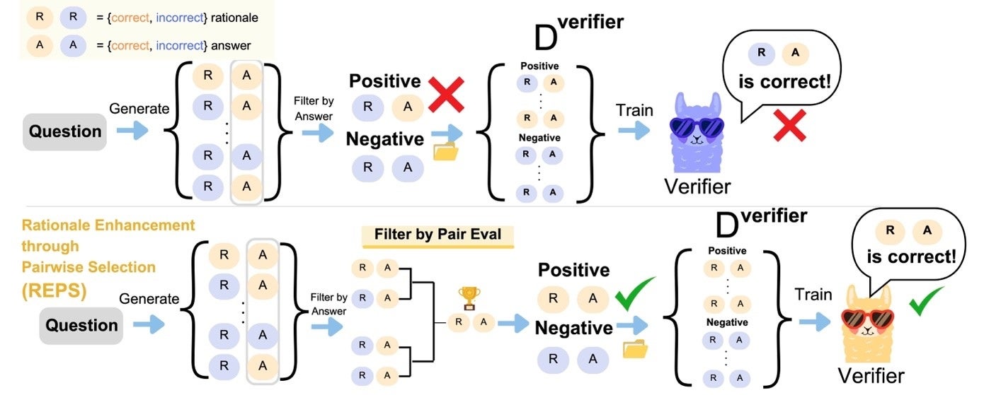 本論文は、国立情報学研究所 菅原朔助教との研究成果をまとめたもので、大規模言語モデル(以下「LLM」)が応答する内容の、真偽性を自動評価するためのLLM(以下「評価用LLM」)の構築手法について提案しました。従来研究において評価用LLMは、評価対象のLLMが出力する最終的な結論の真偽のみに評価の焦点を当て構築されてきました。本論文では、評価対象のLLMが出力する結論だけではなく、結論を導くまでの過程や根拠の妥当性も評価できるような評価用LLMを学習する手法「Rationale Enhancement through Pairwise Selection:REPS」を提案しました。情報の受け手にとっては「結論のみならず結論を導くまでの過程や根拠も重要である」ことに着目したもので、LLM自体の性能向上や、LLMの応答に含まれる嘘(ハルシネーション)の低減や検知にもつながる研究です。