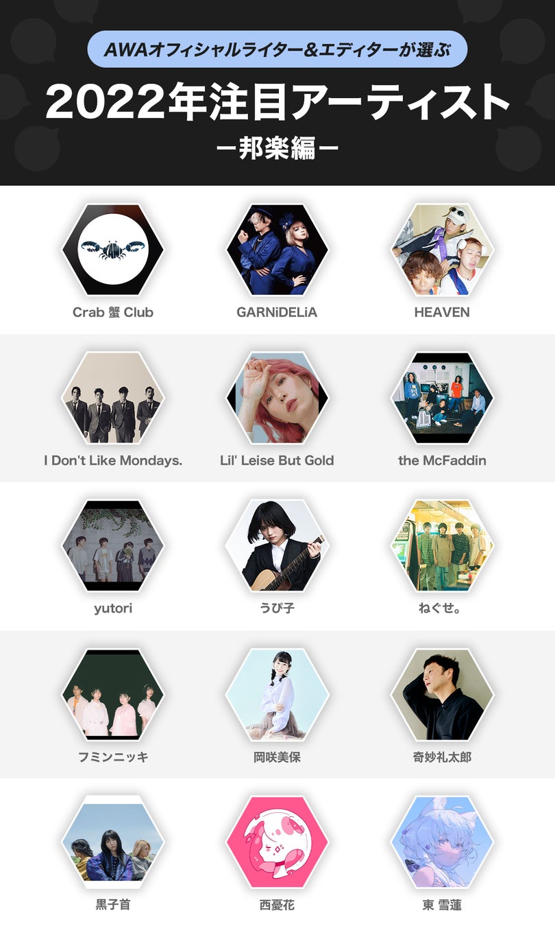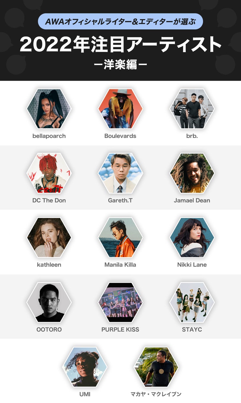 AWA株式会社(本社:東京都港区、代表取締役CEO:冨樫晃己)が運営する、サブスクリプション型(定額制)音楽ストリーミングサービス「AWA(アワ)」は、AWAオフィシャルライター、エディターが2022年に注目するアーティストを発表いたしました。また、各ライター、エディターが選考理由を独自の目線で解説したコメントも合わせて公開。