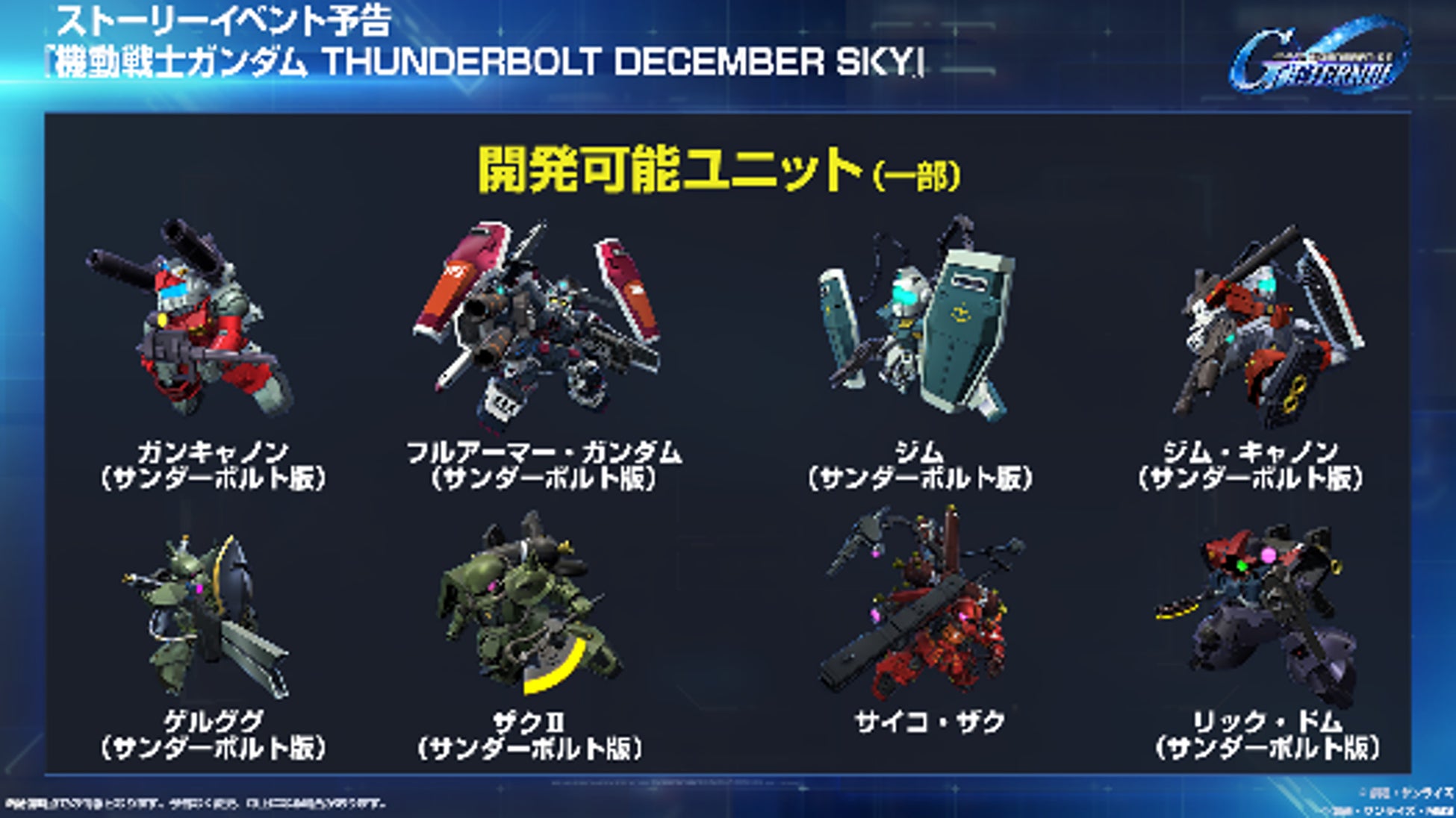 7月以降のストーリーイベントとして「機動戦士ガンダムTHUNDERBOLT DECEMBER SKY」、「SDガンダム外伝 ジークジオン編」、「機動戦士ガンダム鉄血のオルフェンズ 月鋼」が追加予定です。さらなる続報をお待ちください!